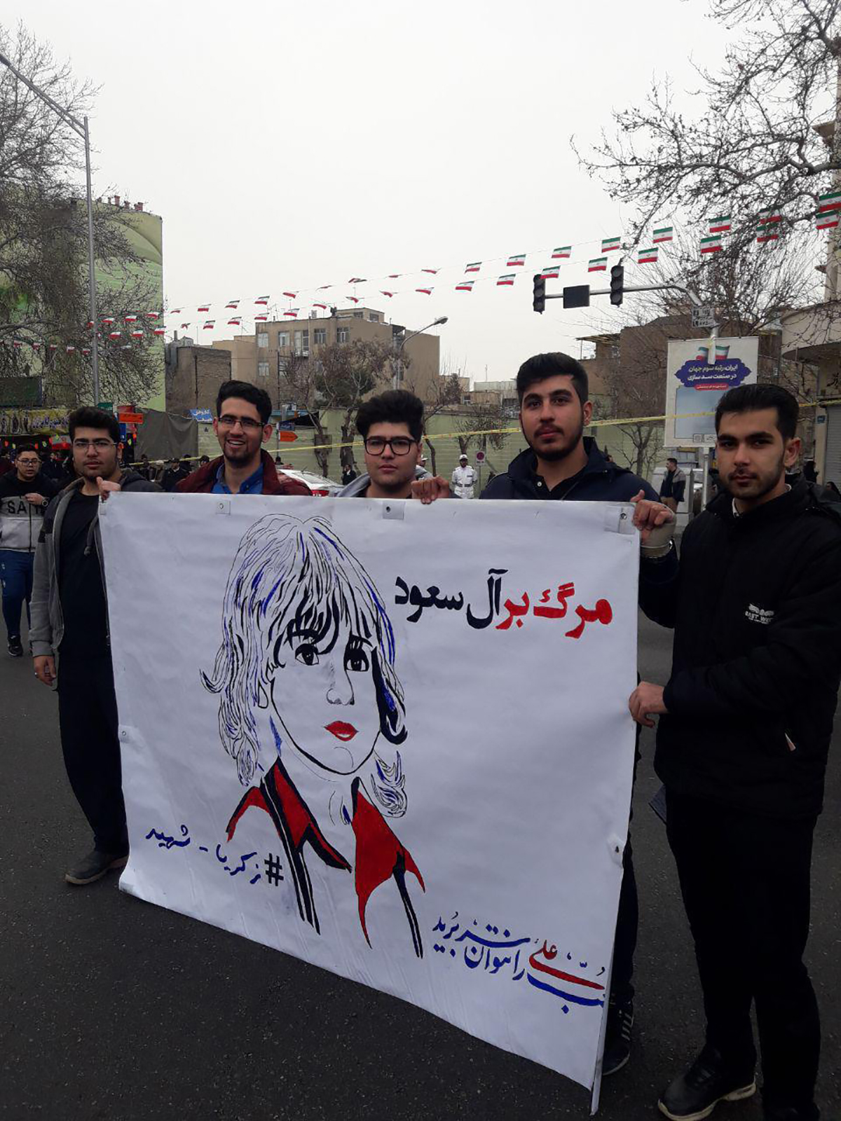 المتظاهرون في مسيرات الاحتفاء بالذكرى السنوية الأربعين لانتصار الثورة الإسلامية يوم الاثنين، صورة الطفل الذبيح زكريا جابر للتذكير بالفاجعة الأليمة التي ارتكبها احد أتباع الوهابية.